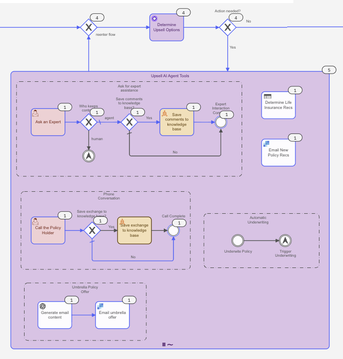 The process snippet below shows an AI Agent Task connector with an ad-hoc sub-process loop for upselling insurance to a customer.