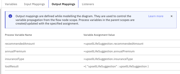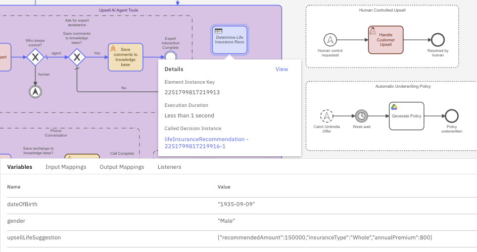 We can also see what is passed back to the agent, upsellLifeSuggestion, which is the output from the DMN table.