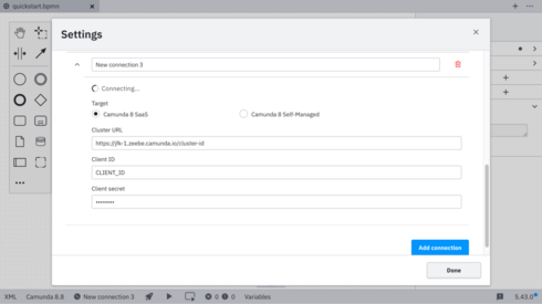 Previously, Desktop Modeler remembered only the last connection configuration, which creates issues including overwriting the connection context. This affected Modeler features that needed an active connection, including deployments, starting instances, and task testing. Essentially, the moment that you switch clusters, your previous configuration is gone. Users should be able to switch between configurations in order to use cluster-related features seamlessly without having to reenter the connection details, losing the original configuration at the same time.
