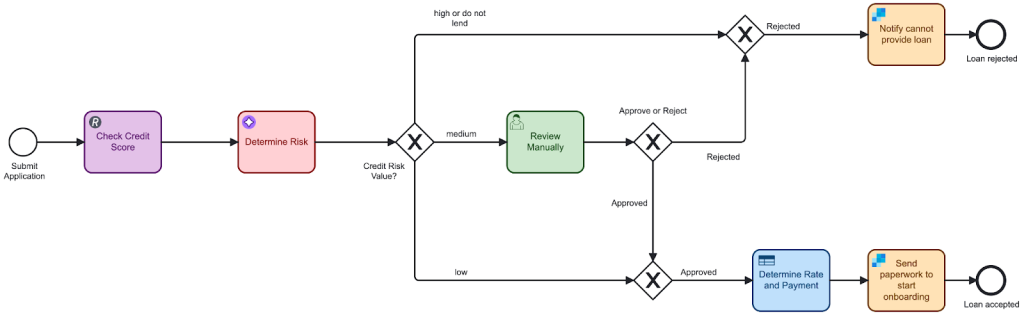 For this example, we replaced the job worker Evaluate Risk in our existing BPMN process with an AI Task Agent connector that will take input data and return the risk based on the factors (obtained in the initial form for our process as well as from the REST API call).