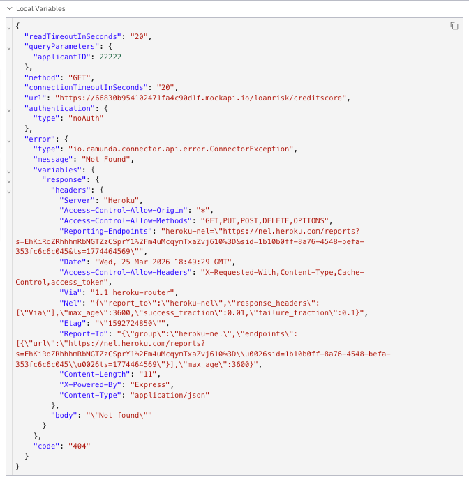 What if there is an error? Let’s take a look using the same task. In this case, we will just enter an applicantID that is not valid (as you can see we have not yet implemented error handling for this REST API call in our process model).