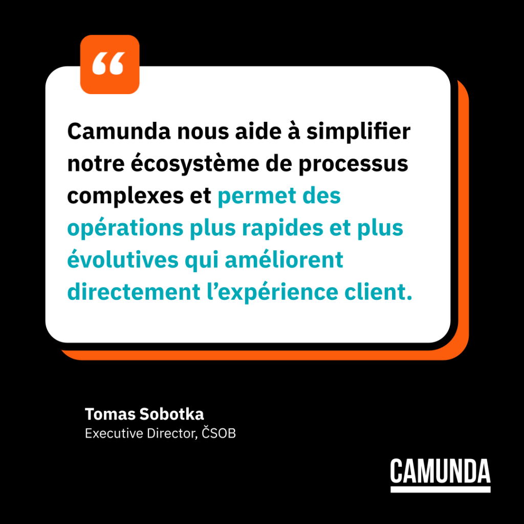 Tomas Sobotka, directeur exécutif chez ČSOB, déclare : « Camunda nous aide à simplifier notre écosystème de processus complexes et permet des opérations plus rapides et plus évolutives qui améliorent directement l’expérience client. Notre préparation pour l’innovation future sera consolidée par cette transformation, qui assurera par ailleurs l’excellence opérationnelle sur tous les canaux. ».