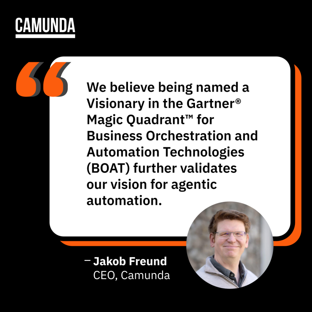 “We believe being named a Visionary in the Gartner® Magic Quadrant™ for Business Orchestration and Automation Technologies (BOAT) further validates our vision for agentic automation,” said Jakob Freund, CEO and Co-Founder of Camunda. “With Camunda, organizations integrate agents into their end-to-end business processes, providing the coordination, accountability, and reliability needed to deliver a meaningful ROI.”