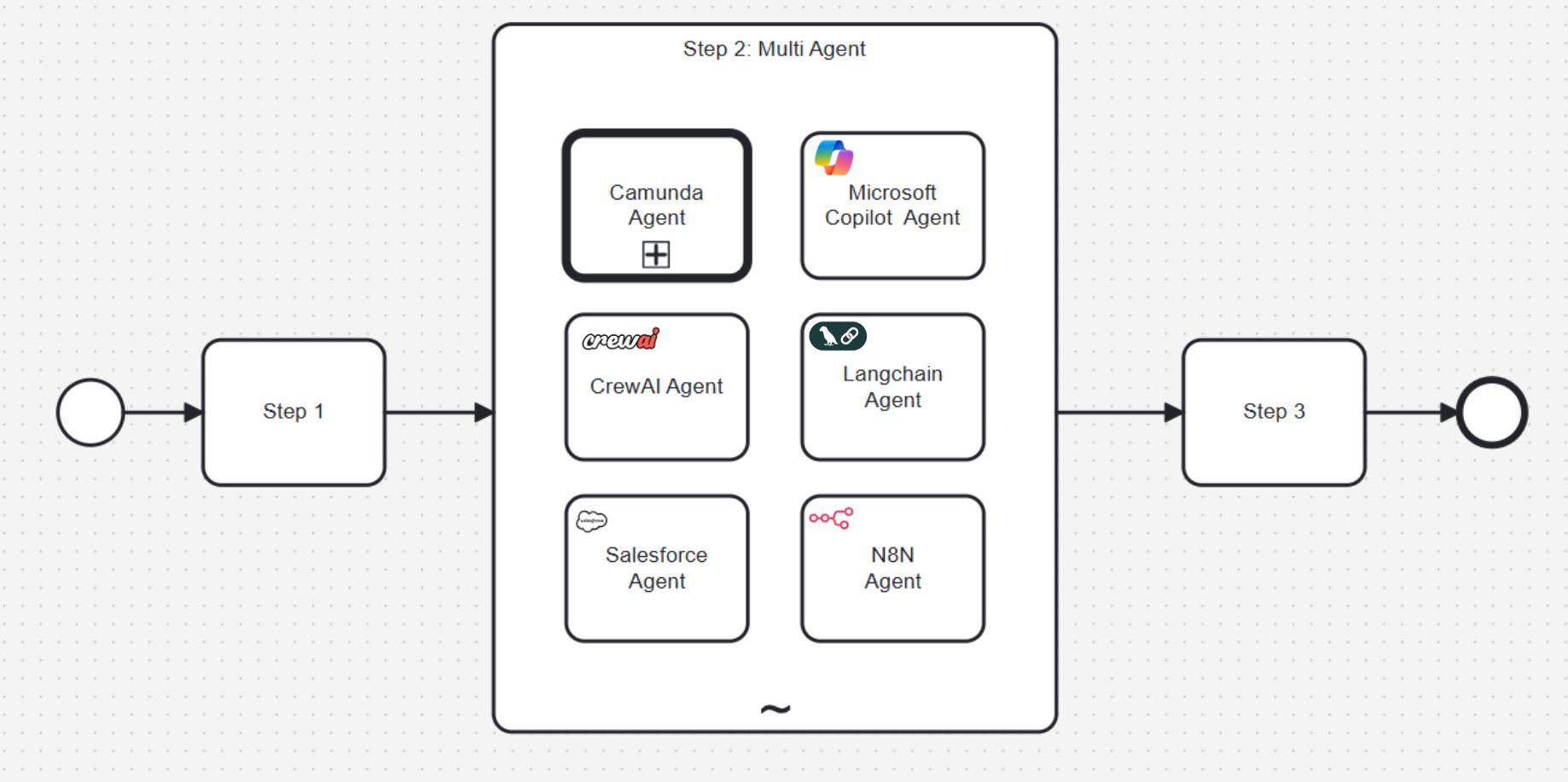 Multi-agent orchestration with Camunda lets you design a central orchestrator to unify any AI agent in your organization. AI Agents from any provider, including Microsoft Copilot, LangChain, Salesforce, CrewAI, n8n, or agents you build yourself in Camunda, are now orchestrated by an intelligent agent within a reusable, governed process.